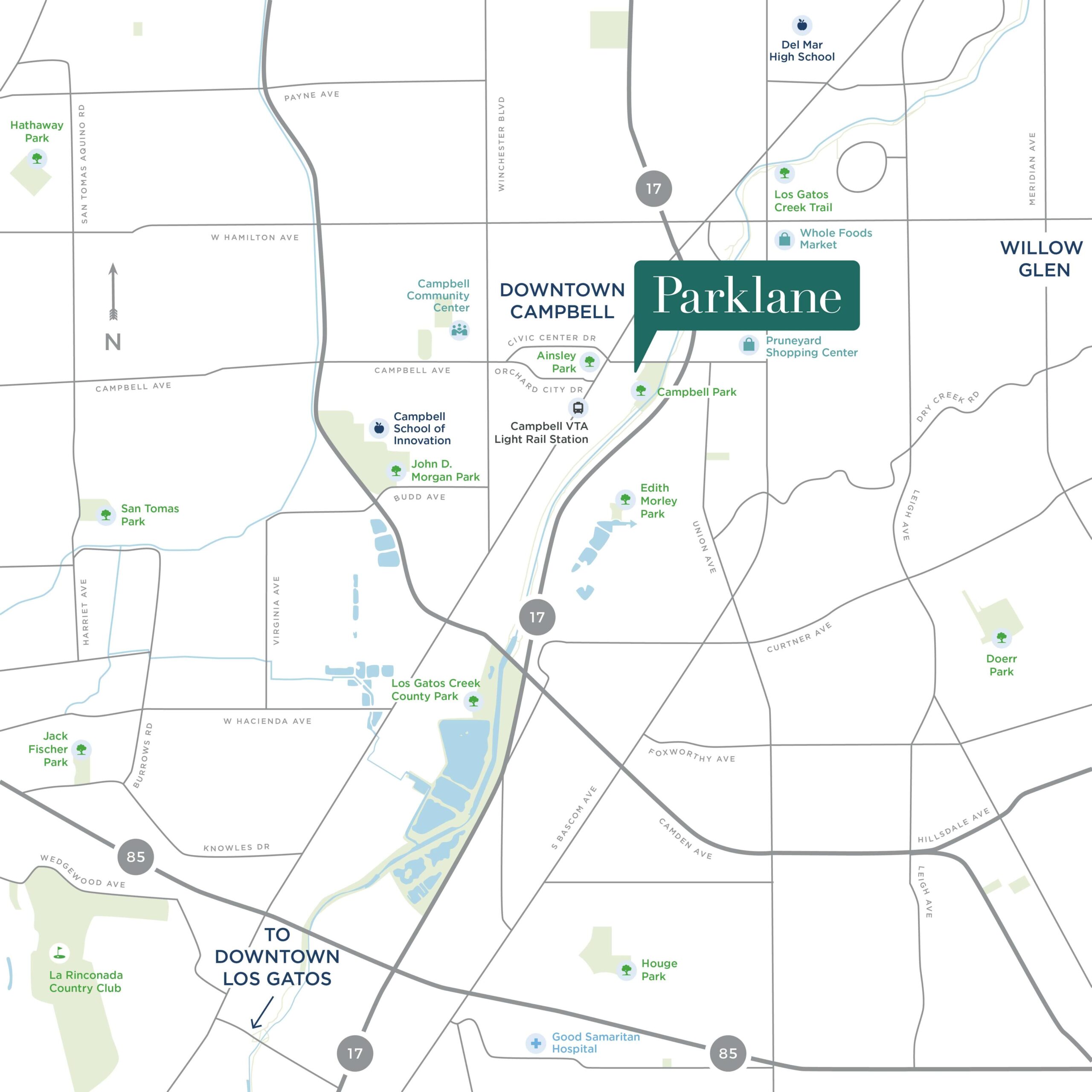 Across the street, Campbell Park provides a natural extension of your living space, offering playgrounds, open fields, basketball courts, and access to the scenic Los Gatos Creek Trail for miles of biking and hiking.